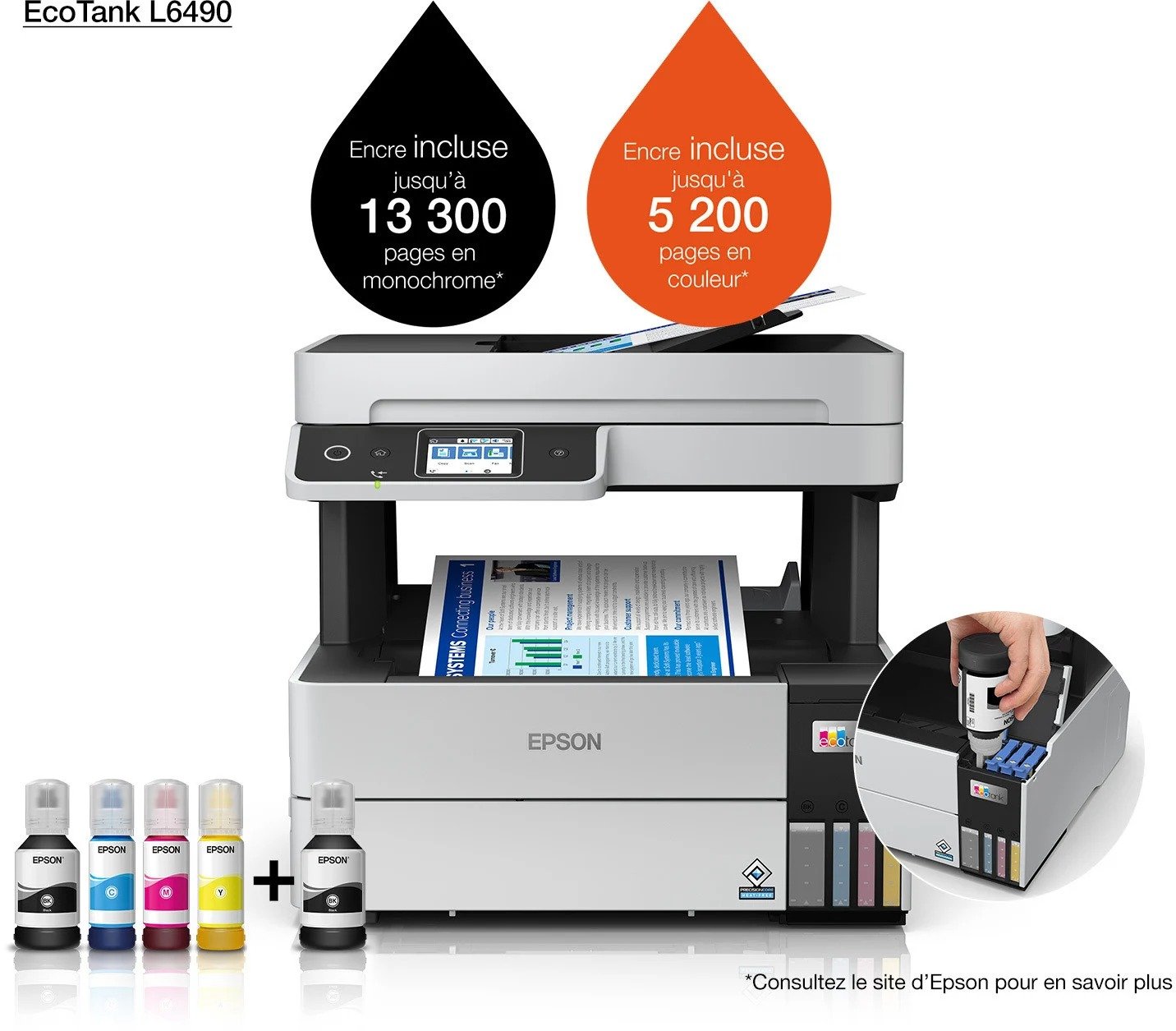 Livrée avec encre noire jusqu’à 13300 pages et 5200 pages en couleur (2 bouteilles d’encre noire de 127ml; 3 Bouteilles d’encre couleurs individuelles de 70ml)